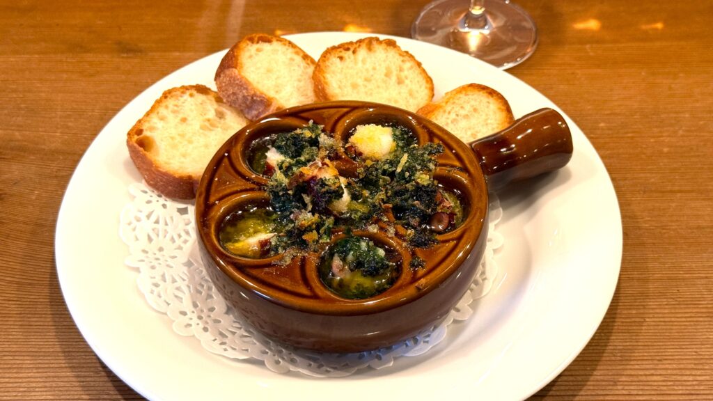 タコひとつでグラス一杯はイケる味わいです。タコがなくなってもエスカルゴバターとパンだけでもまだまだ飲めますよ。